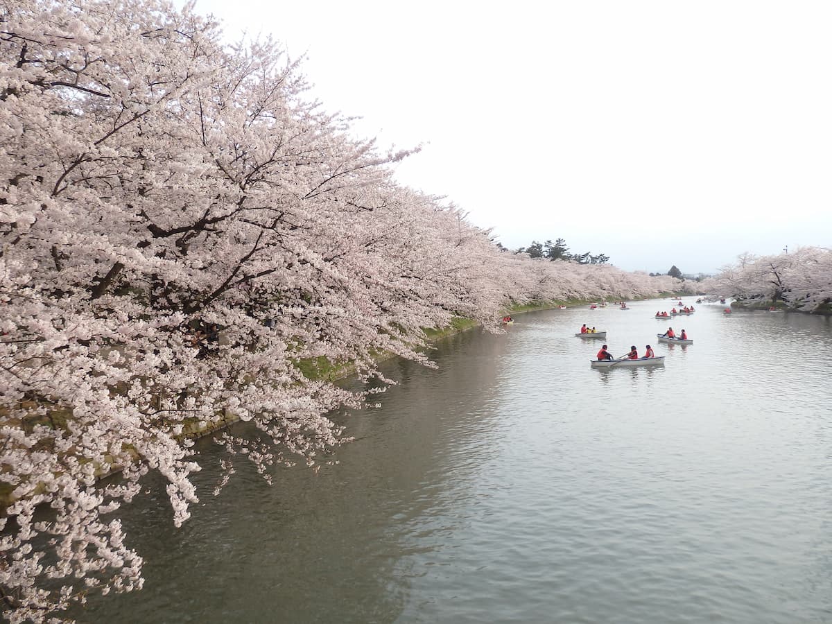お堀の水面に散った花びらが淡い桜色のじゅうたんとなり、水面を染め上げます。咲き始めから散り際まで、移ろう景色を長く味わえるのも、弘前の桜ならではの魅力といえるでしょう。